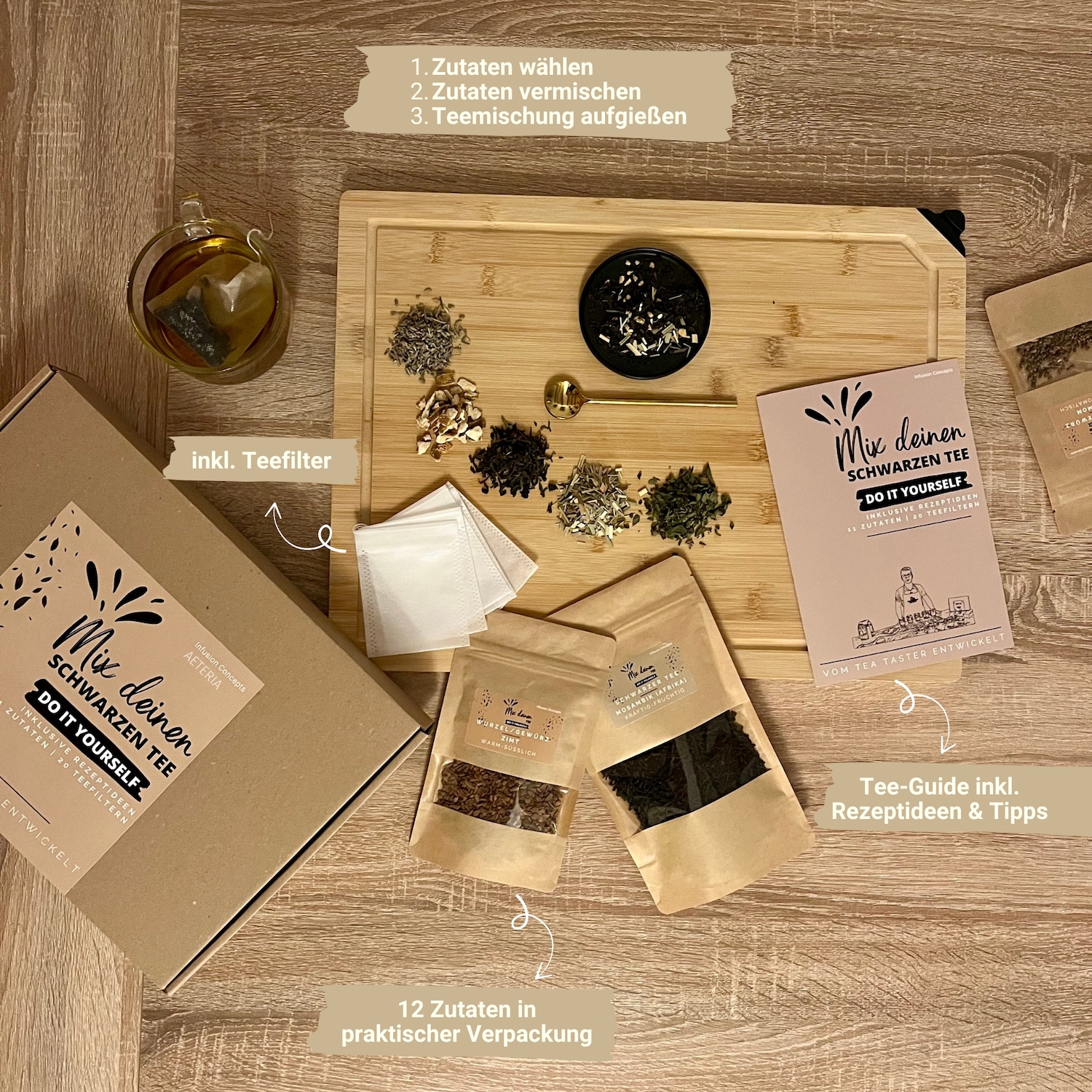 Mische deinen eigenen Schwarztee! Die DIY Box von Infusion Concepts enthält 3 hochwertige Schwarzteesorten und 8 natürliche Zutaten aus Blüten, Kräutern & Gewürzen. Für unzählige Geschmackskombinationen – 100 % natürlich und ohne Zusätze.