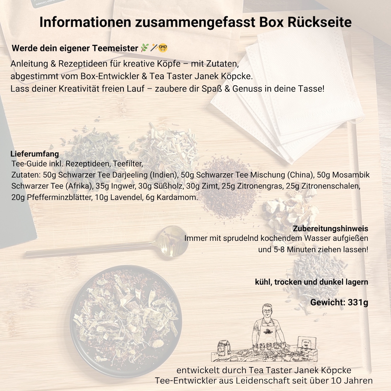 Jede Box enthält eine Mix-Anleitung mit Inspirationen für kreative Teemischungen – einfach, lecker, individuell. Zusätzlich Teefilter, damit sofort losgelegt werden kann. 331g Zutaten, 11 Sorten für ca. 150 Tassen Tee.