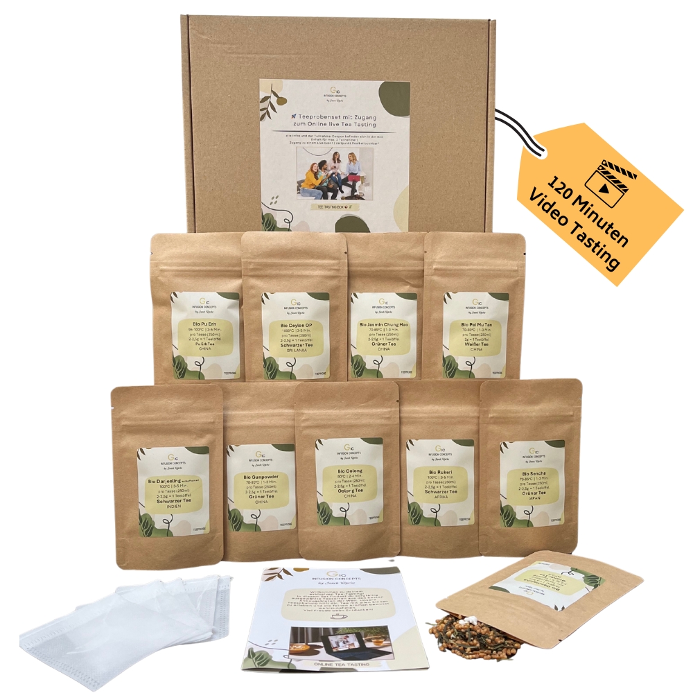 - Eine hochwertige Teebox mit 10 Teeproben, Teefiltern, Info Broschüre & Zugang zum Online-Tasting wird dir direkt nach Hause geschickt